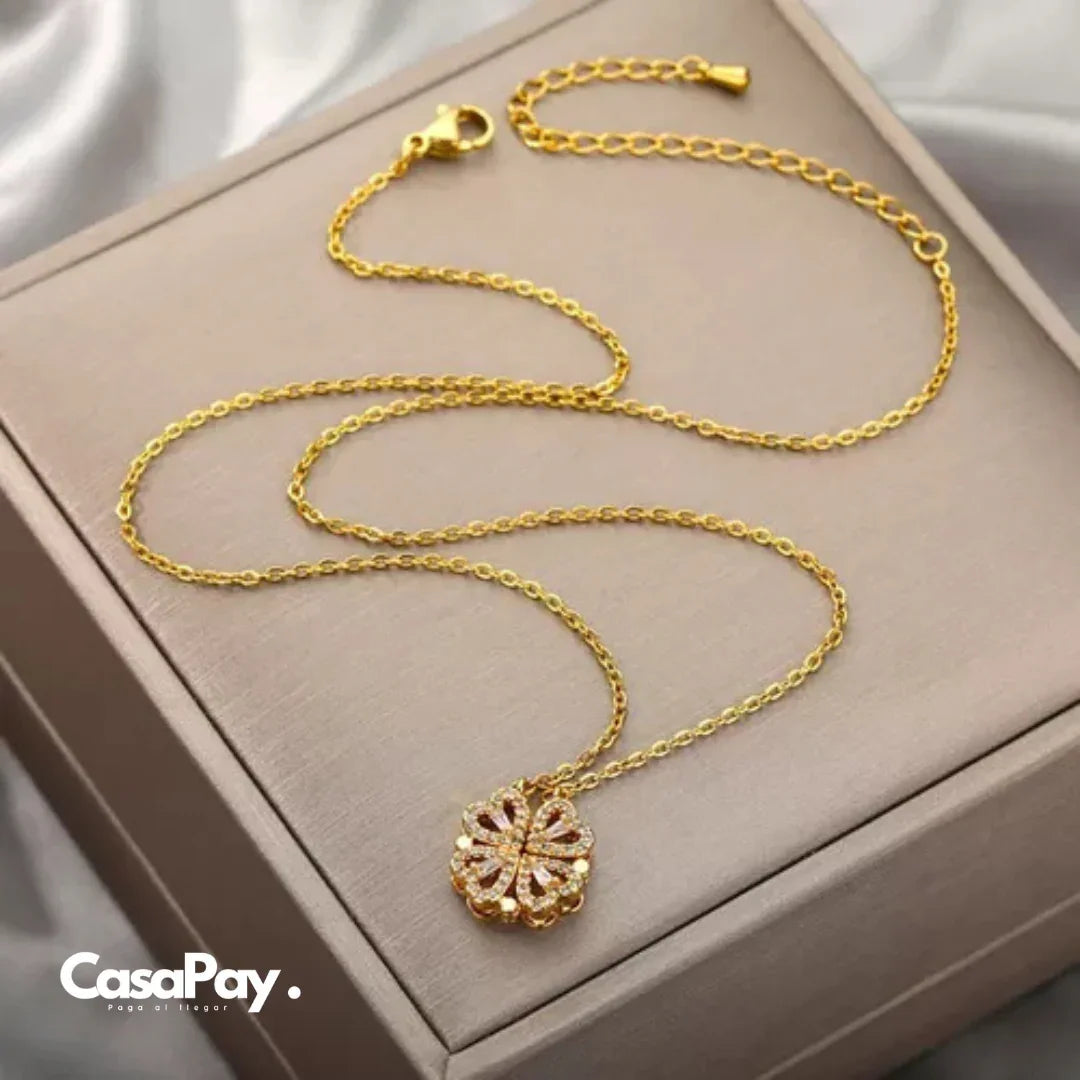 Usarlo es increíblemente sencillo y rápido. Simplemente ajusta los imanes internos del colgante para llevarlo de un elegante trébol de cuatro hojas (símbolo de fe, esperanza, amor y suerte 🍀) a cuatro corazones unidos (pura expresión de amor ❤️). Viene listo para regalar con su Bolsa Altura y Cajita de Regalo incluidas, solo tendrás que entregarlo.